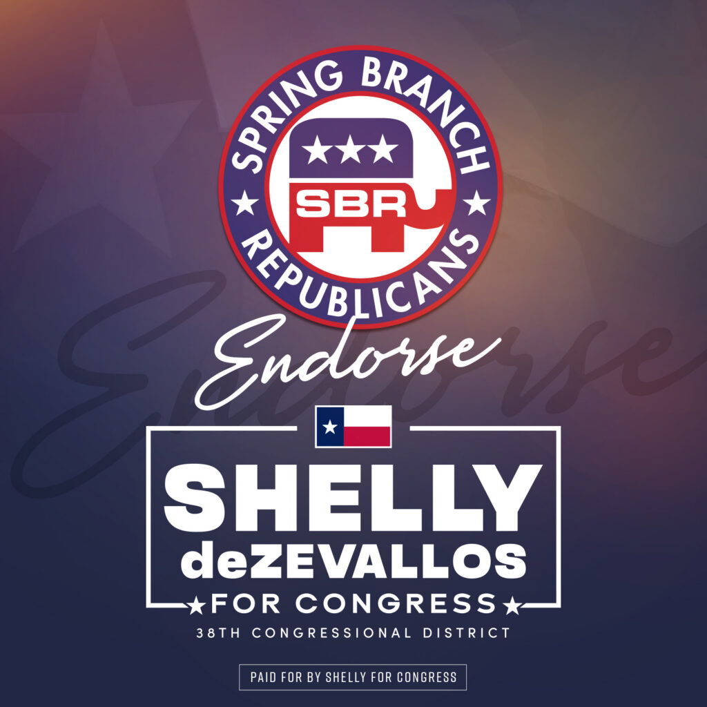 "Dr. Shelly DeZevallos is a proven grassroots warrior and national policy advocate for America First principles. Republican activists and local leaders in Houston know and love Shelly for her dedication to the Republican party and our community, while state and national leaders know and respect Shelly for her expertise and leadership on important conservative policy issues. Countless friends, neighbors, school parents, civic leaders, and elected officials all know Shelly DeZevallos as someone who has stepped up to serve when there is a need. Spring Branch Republicans proudly endorses Shelly DeZevallos for US Congress, District 38."