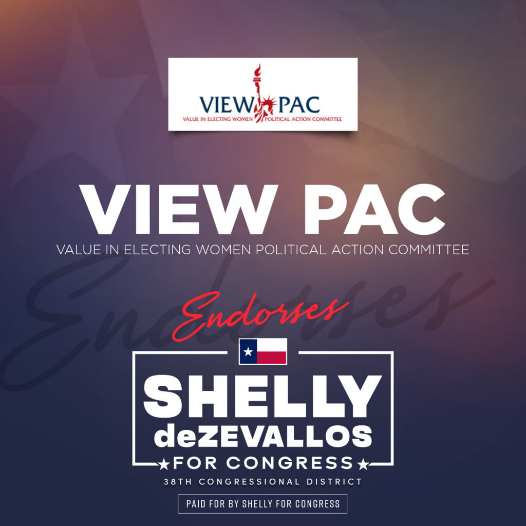 “Shelly deZevallos is a proven business leader and lifelong conservative who has what it takes to take on Washington’s toughest challenges. Through her work in aviation, business, and grassroots Republican politics, Shelly has consistently put Texans first and will bring fresh, accountable leadership to Congress. VIEW PAC is proud to endorse Shelly and know she will serve Texas’ 38th District with integrity and a relentless commitment to preserving Republican values.”