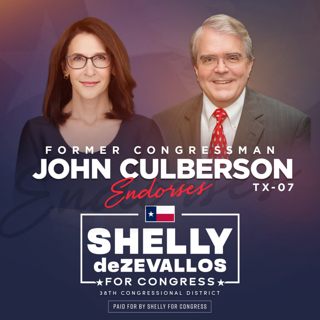 “Shelly deZevallos is an America First patriot who will fight for Texas values and our way of life in Congress. She has been a grassroots conservative activist for decades and served as Vice-Chair of the Harris County Republican Party. Shelly is a committed Christian and dedicated mother and wife. Shelly boldly leads with her faith and the courage of her convictions. You can be sure that Shelly will stand for the sanctity of life, religious liberty, and our Constitution. She will defend our borders, cut reckless government spending, promote free enterprise, and stand up to the Democrats’ radical woke agenda. Shelly will always put God, family, and our country first, and fight every day to protect our freedoms and preserve our historic American way of life. Please join me in supporting and voting for Shelly deZevallos for Congress in the upcoming Republican primary election.”
